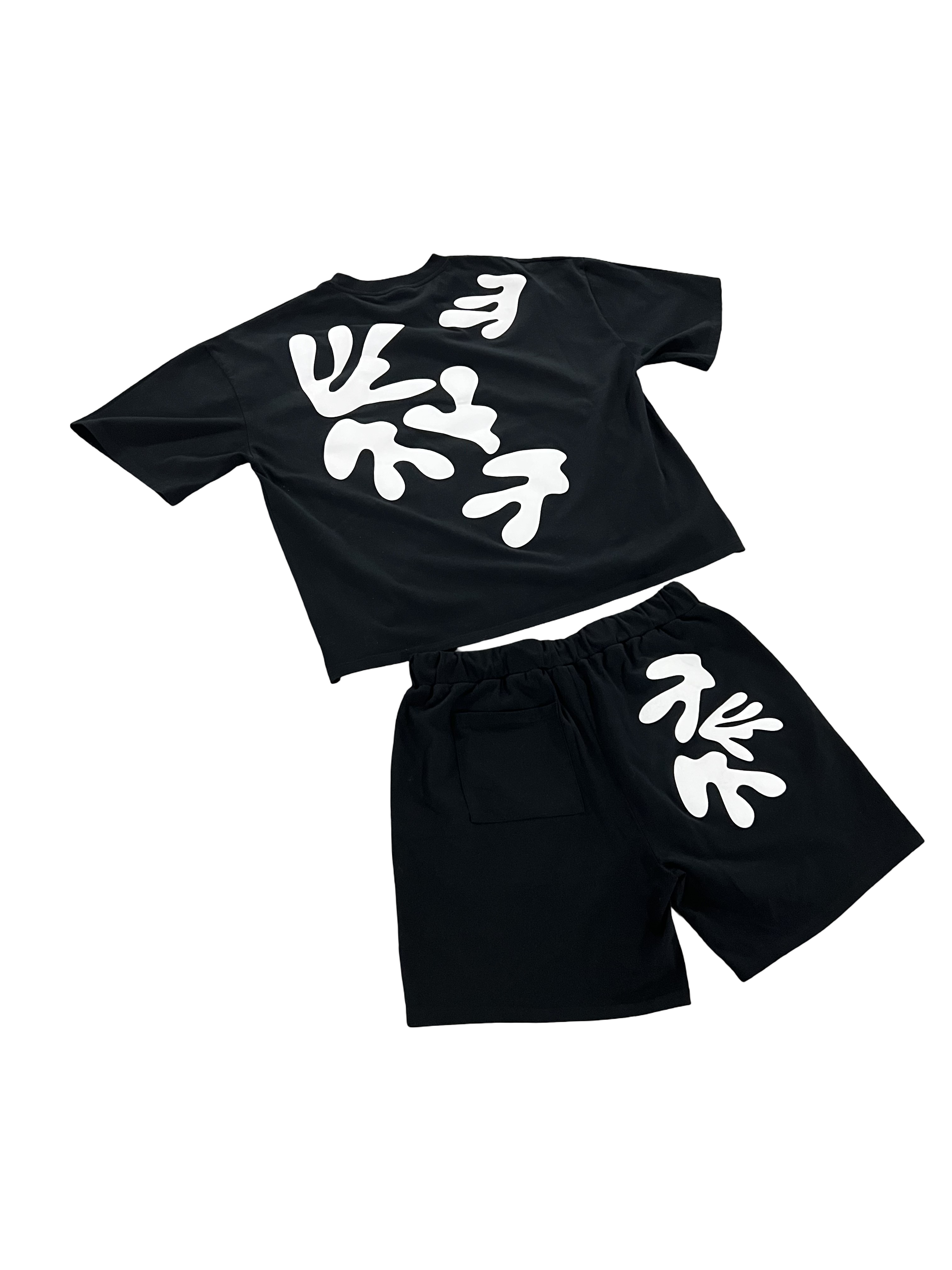 This set is breathable and comfortable for all-day wear. Perfect for staying cool and stylish this summer The black short and t-shirt feature a white puff print for added style.